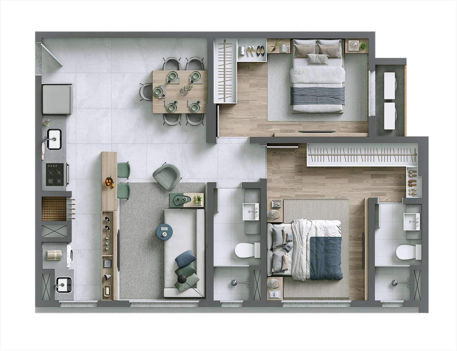 - 02 dormitórios, sendo 01 suíte