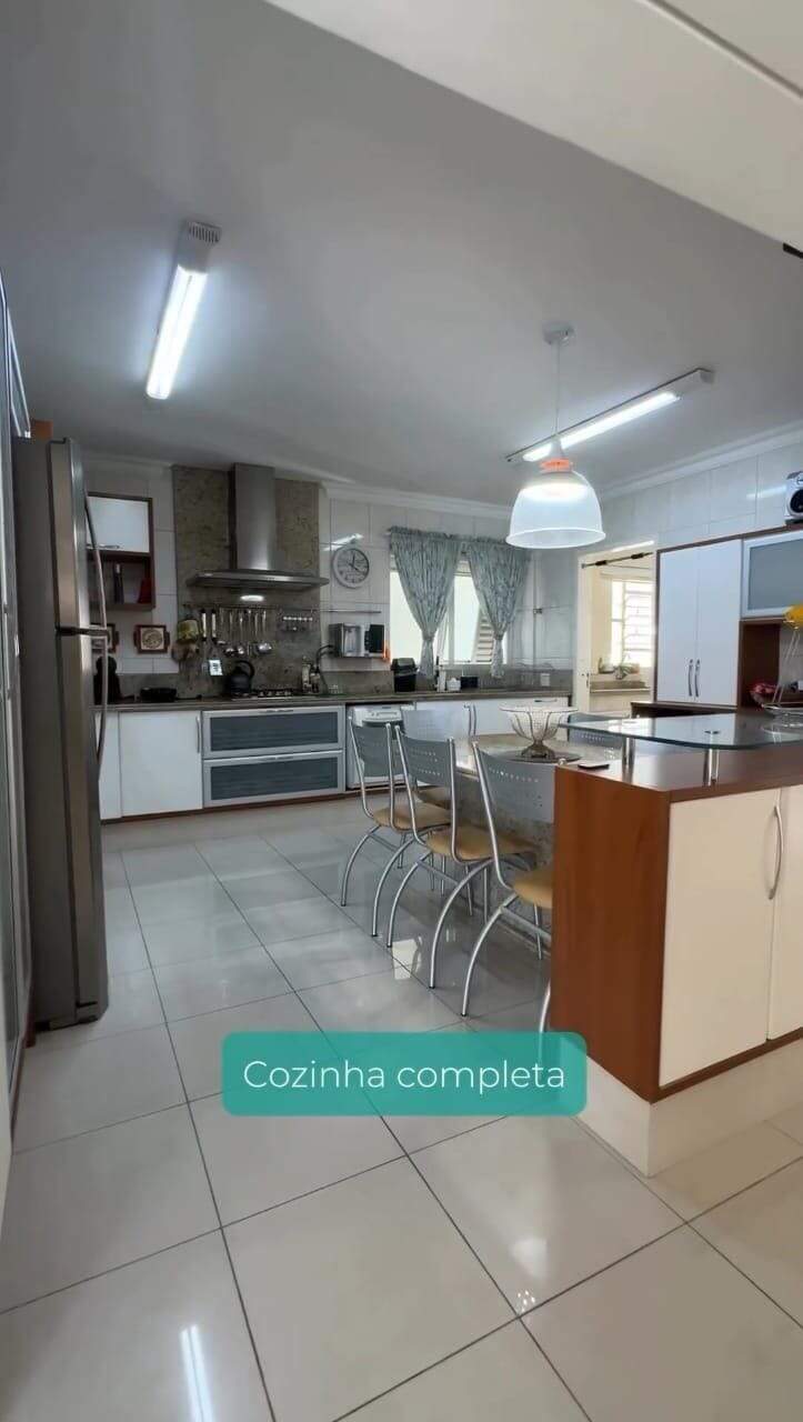Cozinha, armários planejados com mesa em mármore com 7 lugares.