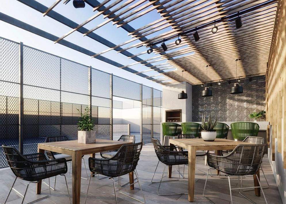 Lavabo, cozinha, living integrado e sacada com Churrasqueira a carvão e 02 vagas privativas.